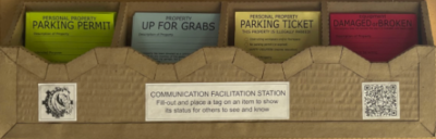 The Communication Facilitation Station is LVL1’s implementation of a Parking Tag System. The station is stocked with tags to provide a method for communicating the status of items in the SynergyMill community space. The goal is to facilitate knowing what belongs to who; what may be done with things that are sitting around; notify others of damaged or broken equipment; and facilitate sorting out active projects from abandoned messes.